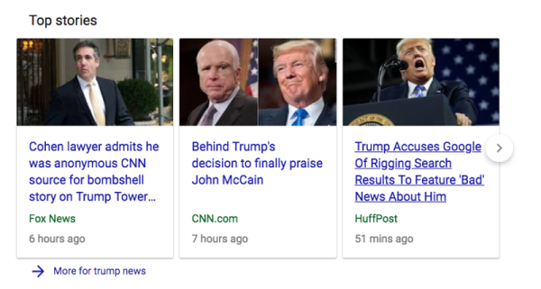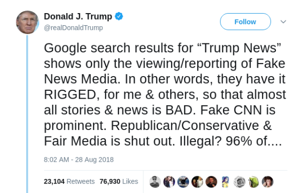 Pada 28 Agustus kemarin, Twitter official Donald Trump memposting twit bahwa hasil pencarian pada Google search berisi berita palsu yang provokatif terhadap sayap kanan. Dirinya menyimpulkan jika berita-berita seperti tersebut sangat banyak sekitar 96%.