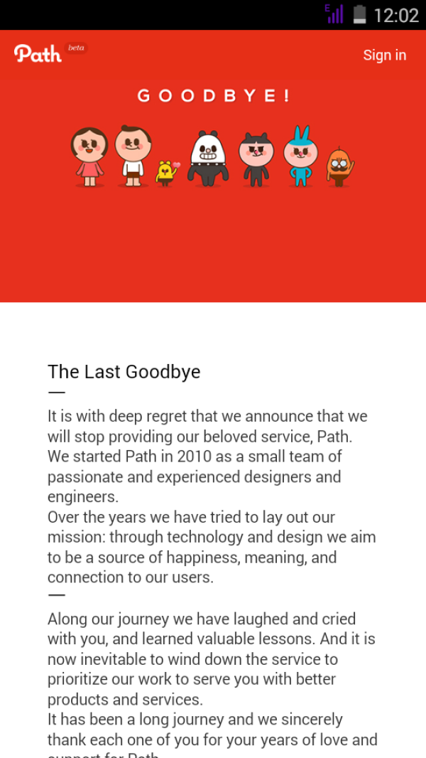 Kabar buruk untuk pengguna sosial media Path. Kompetitor sosial media dari Facebook ini mengumumkan akan menutup layanannya. Sosial media Path yang diluncurkan November 2010 ini akan ditutup bulan depan. Pada blog postnya hal ini dilakukan untuk memprioritaskan layanan lebih baik lagi. Penghetian layanan akan dilakukan 1 Oktober dan efektif akan mencabut aplikasinya pada Google Play dan iTunes pada 18 Oktober.