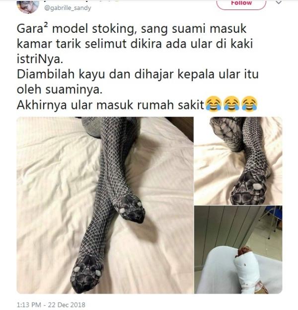 AKTIVITAS seksual yang menyenangkan bisa dimulai dengan kejutan. Ini juga yang membuat Anda bisa merasa spesial di hadapan pasangan.Tapi, apa jadinya kalau kejutan yang diberikan malah membawa mala petaka? Hal ini yang dialami seorang perempuan yang tidak diketahui identitasnya. Dalam postingan akun Twitter @gabrille_sandy, terlihat di sana seorang perempuan mengenakan aksesori berupa sarung kaki berbentuk ular piton.