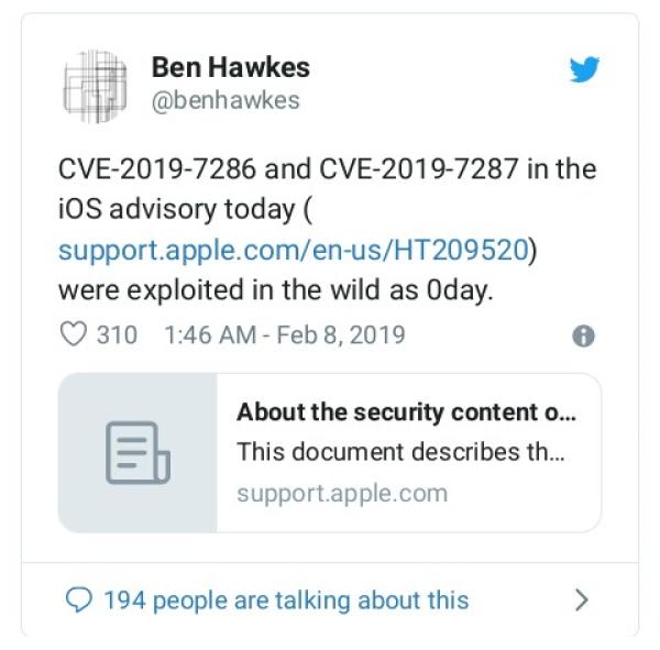 Penanganan vulnerability pertama pada CVE-2019-7286, bahwa vulnerability pada komponen framework bernama iOS Foundation. Komponen tersebut dapat digunakan untuk membuat kerusakan memory. Dengan kerusakan memory tersebut penyerang dapat meningkatkan hak akses pada sistem. Serangan melalui aplikasi buatan yang telah terinstal pada iOS.Penanganan vulnerability kedua pada CVE-2019-7287, bahwa vulnerability pada komponen framework bernama I/O Kit. Komponen tersebut menangani arus data antara hardware dan software. Aplikasi buatan menggunakan hak akses kernel dapat membuat kerusakan memory dengan menjalankan metode arbitary code.Dalam changelog tersebut juga tercantum credits penemu dua vulnerability tersebut yaitu satu orang peneliti anonymous, Clement Lecigne dari Google Threat Analysis Group, Ian Beer dari Google Project Zero, and Samuel Groß dari Google Project Zero.ZDNet telah mencoba menghubungi Apple dan Google namun tak ada tanggapan terkait bagaimana kerja penggunaan vulnerability dan kaitannya dengan zero-days.