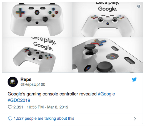 Ikutnya Google dalam persaiangan industri game terbukti dengan rencana mengembangkan alat kontrol game yang mirip dengan joystick. Hampir sama dengan controller yang lainnya yaitu mempunyai dua analog, empat tombol dibagian kanan, d-pad dibagian kiri, empat tombol dibagian bahu controller. Hal yang membedakan dengan controller lainnya sepertinya fitur yang akan diberikan oleh Google nantinya. Google assistant ataupun voice communication sepertinya adalah fitur terbaru yang akan dikeluarkan oleh Google untuk gaming consolenya.
