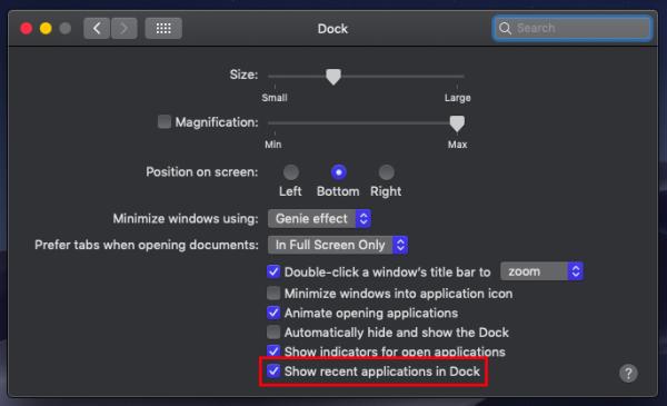 Untungnya fitur baru recent apps dapat dimatikan sehingga akan seperti dock pada Mac OS versi sebelumnya. Dengan masuk ke window pengaturan dock dengan Apple menu > System Preferences > Dock, untuk mematikan fitur recent apps yaitu dengan menghilangkan centang pada "Show recent applications in Dock" begitu sebaliknya jika ingin mengaktifkannya kembali.