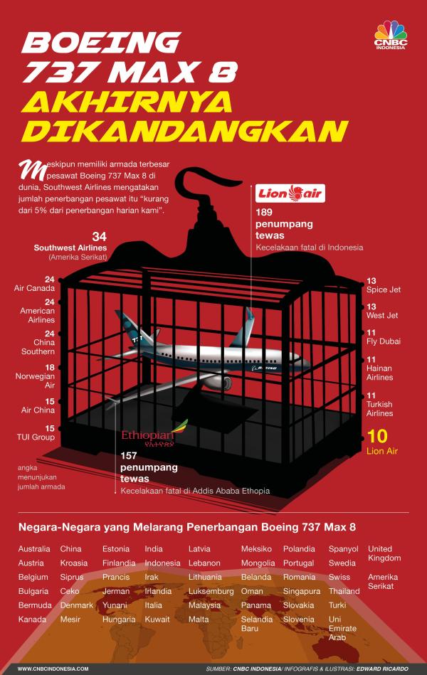 Administrasi Penerbangan Federal (FAA) Amerika Serikat (AS) dan regulator lainnya di seluruh dunia menyelidiki dan melarang terbang model pesawat Boeing 737 MAX 8 pekan lalu setelah mengalami kecelakaan lagi di Ethiopia pada 10 Maret menewaskan 157 orang. Pada 29 Oktober 2018 kecelakaan sebelumnya dengan model pesawat yang sama telah menewaskan 189 orang di pulau Jawa setelah lepas landas dari Jakarta.