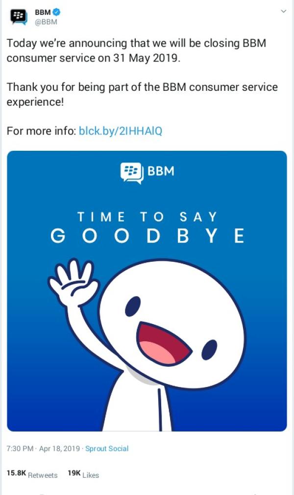 Lewat Twitter pada tanggal 18 April, BlackBerry Messenger mengumumkan akan menghentikan layanannya yang efektif pada 31 May. Pengguna masih bisa mengambil data sampai setelah 7 hari pengumuman.