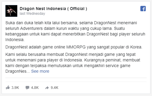 Semakin berkurangnya pemain dalam permainan game online secara otomatis mengurangi dukungan game online untuk bisa bertahan memberikan layanannya. Begitupun game online DragonNest, dalam official halaman Facebook-nya memberitahukan jika akan menutup layanannya karena kurangnya peminat. Game online yang menutup layanannya untuk Indonesia bukan hal yang baru, seperti Ragnarok Online 2 ataupun SD Gundam Online.