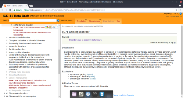 Dalam dokumen berbentuk draf milik WHO yang masih dalam tahap beta. Menjelaskan sedikitnya tiga karakteristik gaming disorder, yaitu tidak dapat mengendalikan kebiasan bermain game, memprioritaskan game diatas kepentingan lainnya dan tidak berhenti bermain game meski menyadari dampak negatifnya.