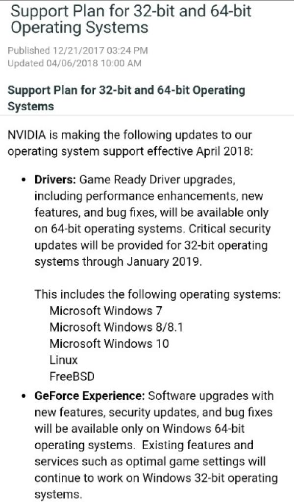 Dengan berkembangnya teknologi menjadi hal yang wajar jika perangkat dengan teknologi rendah ditinggalkan. Seperti pernyataan NVIDIA di bulan April ini, yang mengumumkan penghentian support driver pada sistem operasi 32-bit. Penghentian tidak secara total, karena NVIDIA masih memberikan support hanya pada sisi keamanan critical security update sampai Januari 2019.