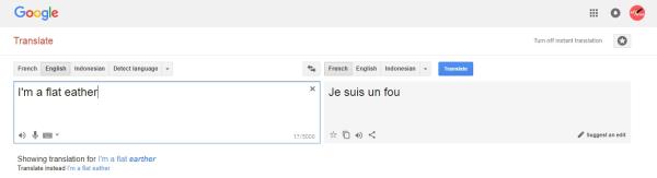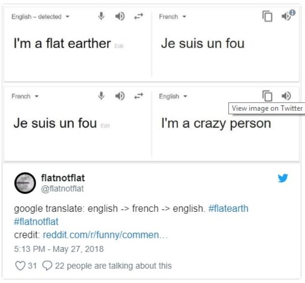 Perusahaan Google sering menciptakan easter egg pada layanannya seperti "do a barrel roll" atau permainan pada halaman utama Google. Tapi kali ini pada Google Translate yang mengartikan cukup mengena bagi Bumi datar. Dengan menggunakan Google Translate dengan bahasa Inggris kalimat "i'm a flat eather" yang berarti aku seorang penganut bumi datar, jika diterjemahkan ke bahasa Perancis/France melalui Google Translate maka hasilnya kalimat "je suis un fou".