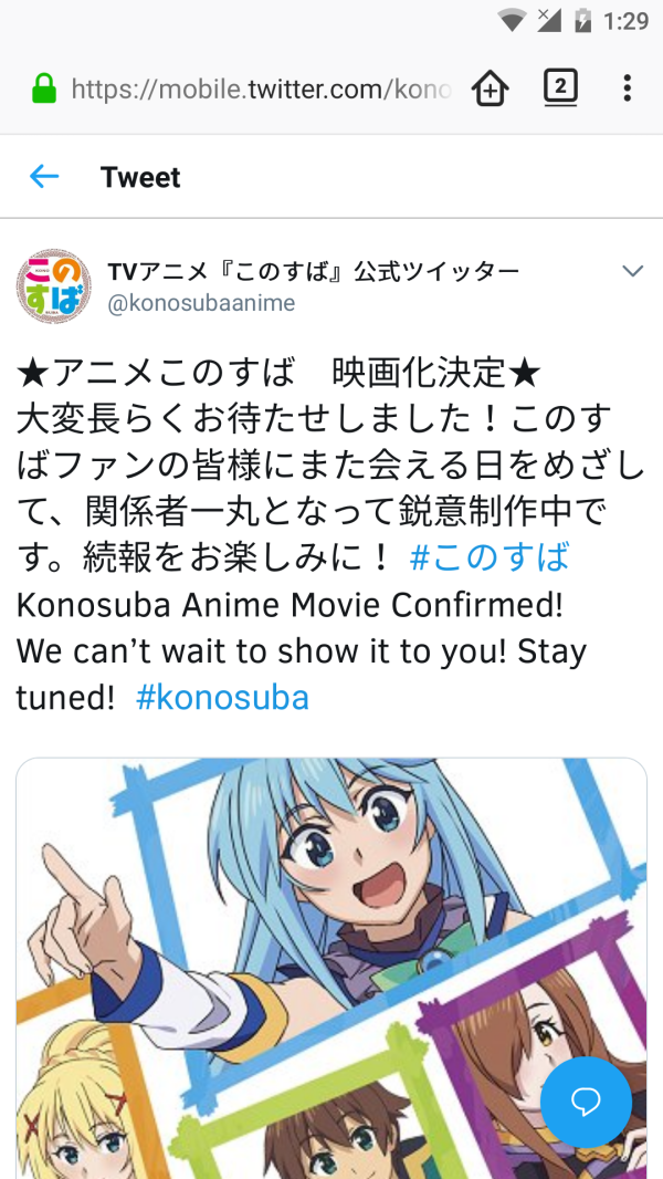 Setelah merilis dua season animasinya, Konosuba mengkonfirmasikan lewat Twitter pembuatan filmnya. Konosuba tidak hanya berhasil merilis dalam bentuk seri animasi tetapi juga buku light novel series dengan cerita yang lebih lengkap dari versi animasi.